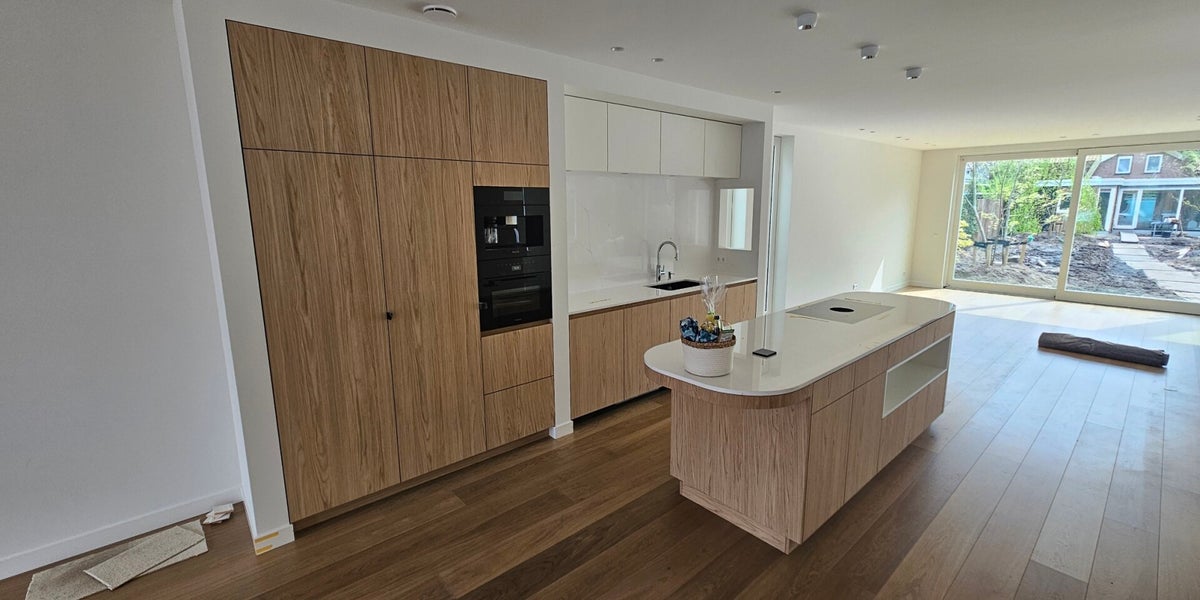 In deze nieuwe keuken komt de warme uitstraling van Eiken fineer prachtig tot zijn recht. Het gebruik van dit natuurlijke materiaal geeft de ruimte een tijdloze elegantie en een uitnodigende sfeer.